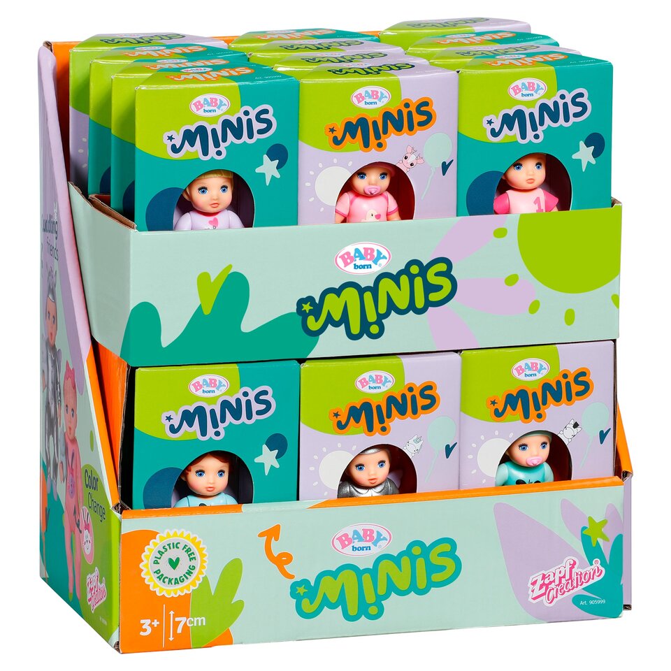 Play together everyday with the BABY born Minis!Perfect for Mini adventures, these cute and compact 6.5-7cm dolls can fit into any bag or pocket, ready for play with your little explorer!Meet the adorable babies with their clip on animal friends and magical colour changing or metallic effects or join their colourful Sisters or Brothers with interchangeable headwear accessories that can be mixed and matched.BABY born Mini dolls – Collect them all! Moveable heads, arms and legs for realistic play.Each 6.5cm BABY born Minis baby doll includes a clip on animal friend, a colour change or metallic effect, a collector’s poster and a sticker sheetEach 7cm BABY born Minis Brother or Sister doll includes a stylish accessory, a collector’s poster and a sticker sheetPerfect for building little imaginations or expanding with our quality BABY born Minis playsets (sold separately).Mini adventurers with BIG personalities! Suitable for children aged 3+. Comes in 100% plastic free pack