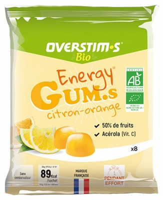 Overstims Energy Gums Organic 8 Gums are soft little bites made with organic fruit, organic acerola which provides natural vitamin C, and sodium electrolytes. They are suitable for all sports and can be consumed before or during sport.